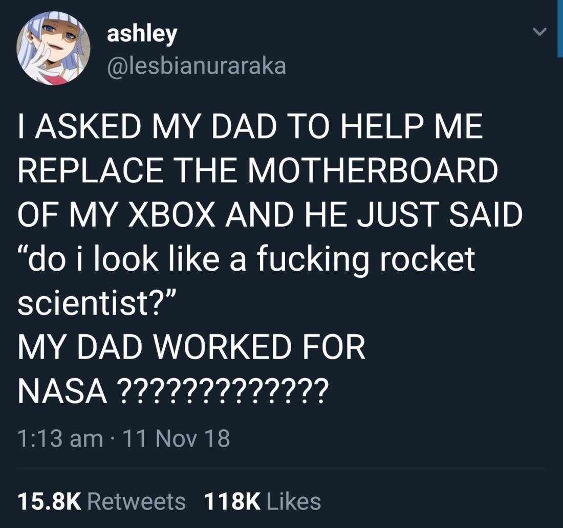 corvidmurtazin Uncategorized November 24, 2018December 7, 2018 1 Minute castielsteenwolf: amelie-not-amelia: Same energy one time i texted my fireman dad saying something was “lit” and he responded “please dont say that” Share this: Share on X (Opens in new window) X Share on Facebook (Opens in new window) Facebook Like Loading... Related Published by corvidmurtazin View all posts by corvidmurtazin Published November 24, 2018December 7, 2018
