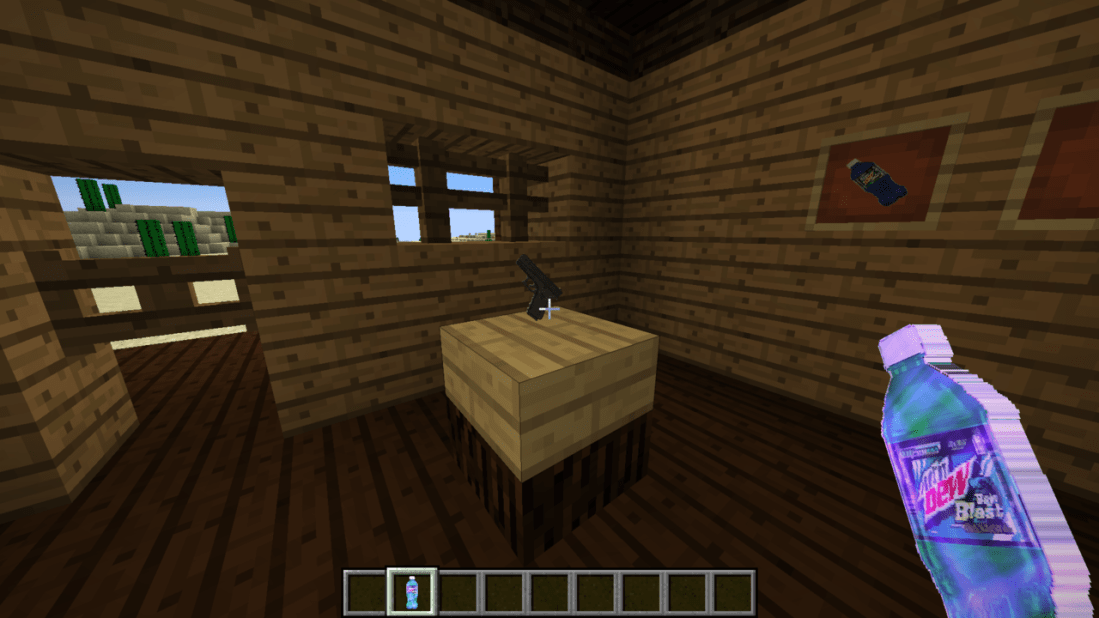 so far i have baja blast for potions, a dewalt power drill for a diamond pickaxe, a gun for a bow, and a folding chair for diamond sword. if anybody has a request for other objects to be added speak up now