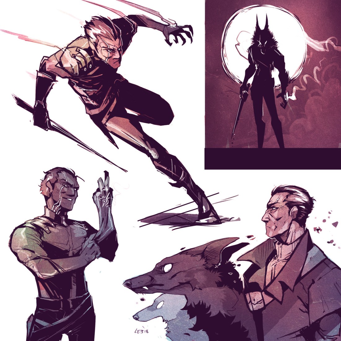 Drew some Dauds for my werewolf!au to go along with my Corvo one. Mostly I just kinda… wanted to draw him in the black, buckled shirt we see in his DH1 concept art, I’m not really sure why they ditched that look for Daudo so I decided a young Daud would wear something similar, before picking up the Whalers and forming his pack. It also just…gave me an excuse to draw Daud…
