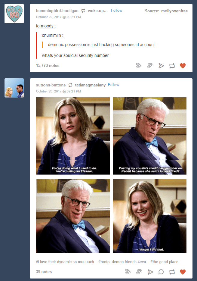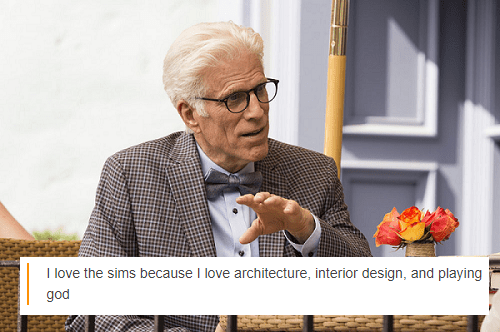 And, for what it’s worth, Chidi’s assignment to the bad place is also entirely bogus. The guy has some obvious neurodivergence that genuinely makes his own life difficult for him. He needs therapy, and probably meds, not to be sent to hell.There is no malice in Chidi that would merit that sort of punishment, but because of the way the system is set up with its black/white ethics, there he is.